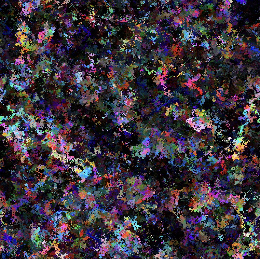 after implementing the generator, i ran it with different parameters, color spaces, and iteration counts. dense fills (200M iterations) create saturated, complex-looking patterns. sparse fills (10M iterations) leave more of the canvas visible, giving a lighter feel. different starting positions (random, center, corner) change how the color distributes across the image.