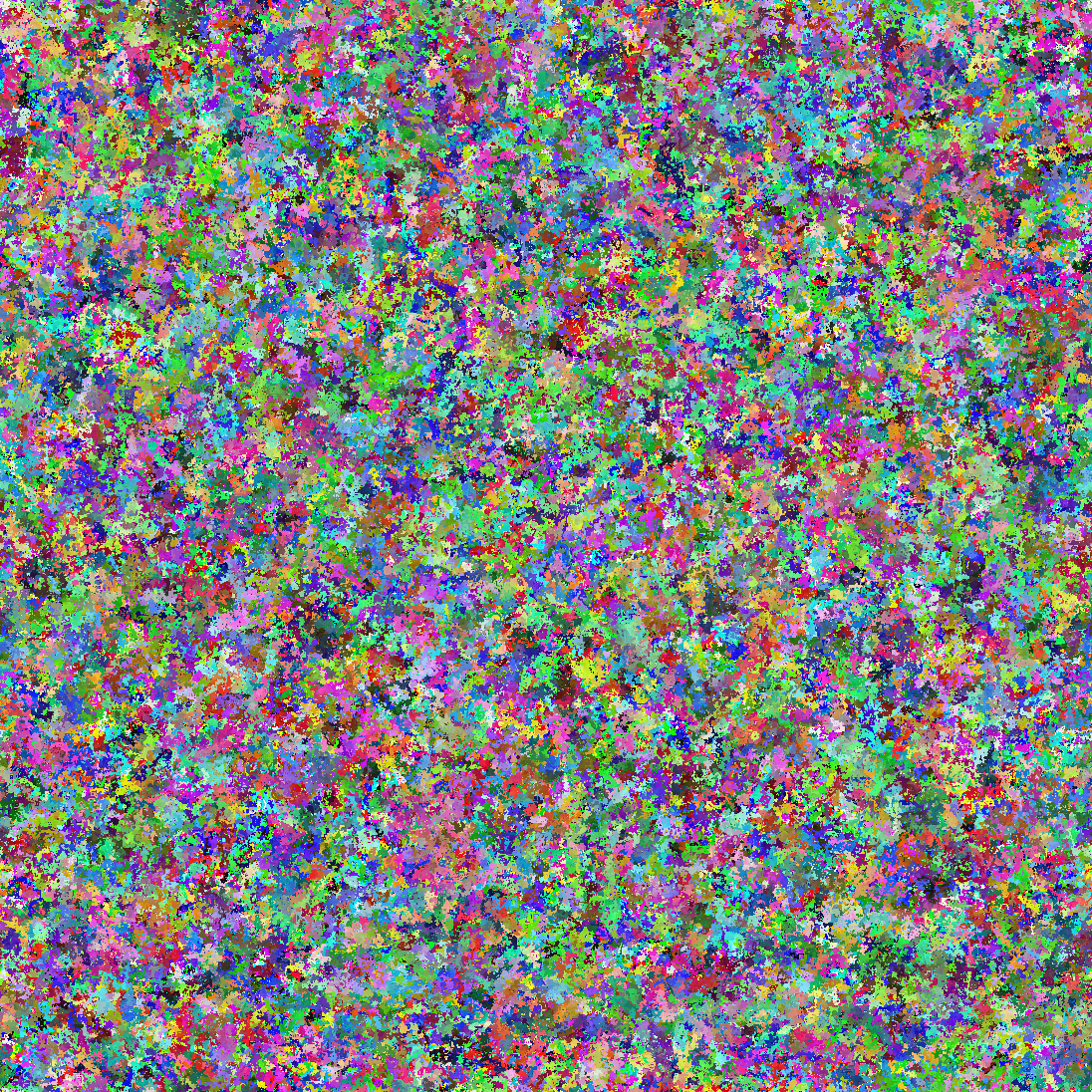 crucially, this is still equivalent to a 2D random walk in terms of space filling, not a 5D walk. the three color dimensions are bounded and wrap around, so they don't let the walk escape to infinity. only the two spatial dimensions matter for Pólya's recurrence theorem. the walk is guaranteed to return to every pixel eventually, painting it with different colors each time.